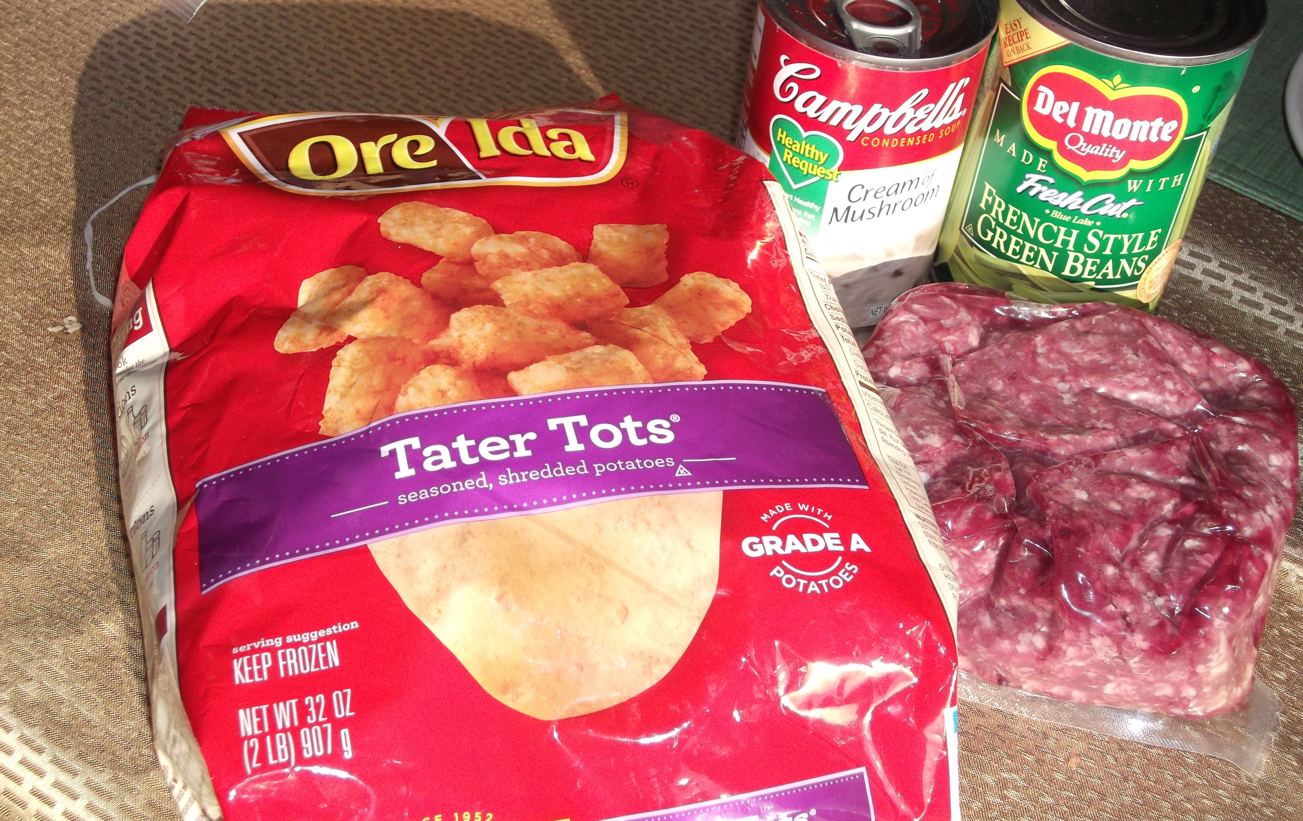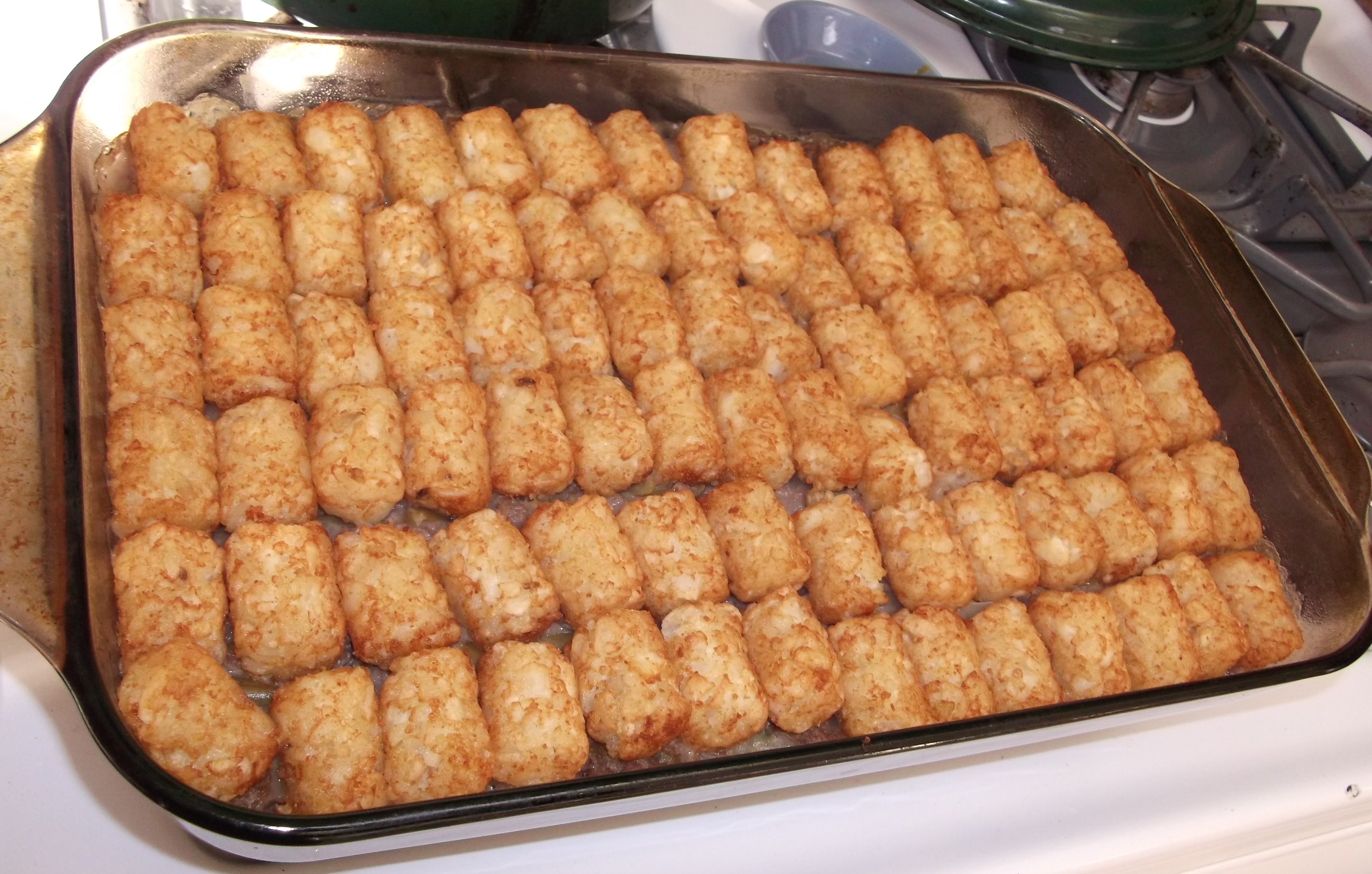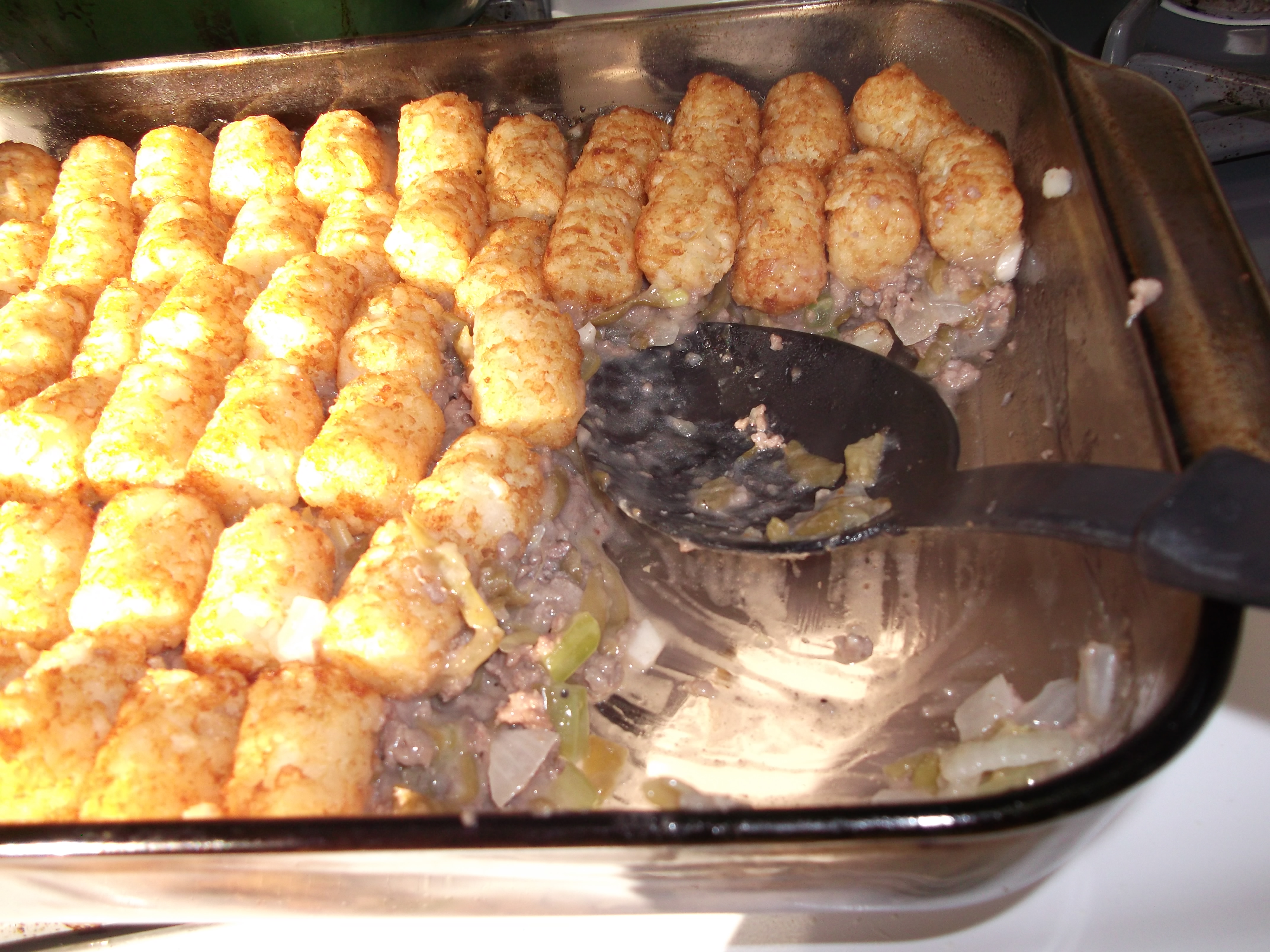 Spread evenly into a 9 x 13 baking dish and cover with a layer of tater tots. Bake uncovered at 350° F for 30-45 minutes or until bubbling. Allow to stand for 10-15 minutes before serving.