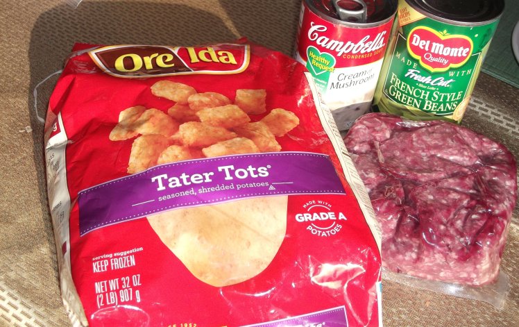 Your grocery list, excluding staples such as onions, garlic and celery, are just these four ingredients. You may use whatever brands you want, but be sure to get French Cut green beans. The regular ones just seem too thick.