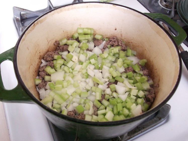 Brown the ground beef in a large pan over medium heat, breaking it up into smaller pieces as it browns. I like to use my Dutch oven, as it is large enough to stir everything in later without spilling over. Once the beef is mostly browned, tilt the pot to one side and spoon out any excess fat, but not all of it: Leave about a tablespoon remaining in the pot. The goal is to leave enough fat to boost the flavor but not feel too greasy. Add the onion, celery, and garlic and continue cooking until they are soft and the beef is completely browned.