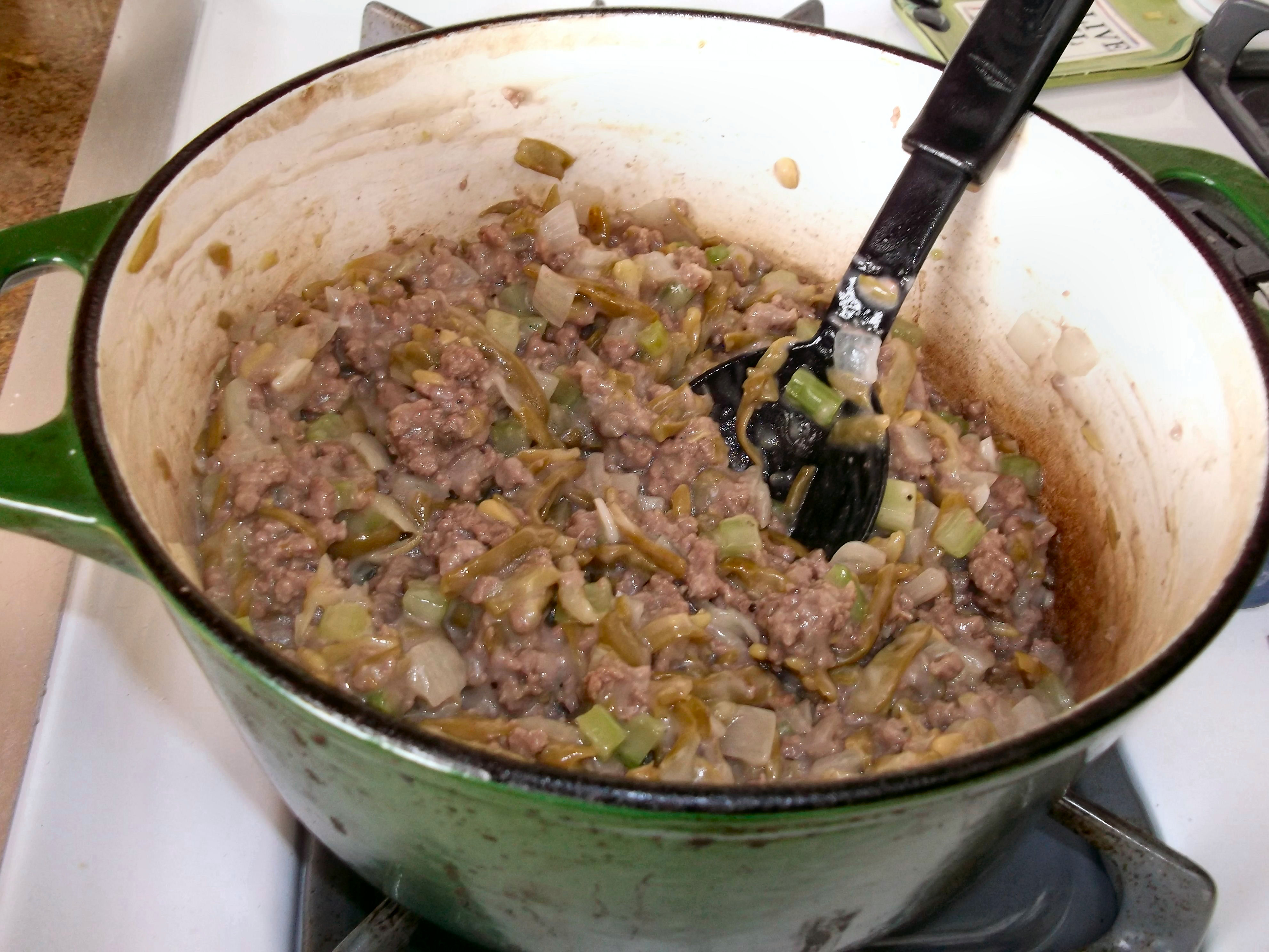 In a large pan over medium heat, brown the beef. When most of the red color is gone, spoon out excess fat (but leave some behind) and add the onion, celery, and garlic. Continue cooking, stirring often, until the beef is completely browned and the onions and celery are softened. Remove the pan from the heat and stir in the soup, green beans, and salt and pepper.