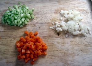 Dice the onion, celery, and carrot to get roughly two tablespoons of each. If you want, you can chop the celery and carrot a little coarser.
