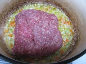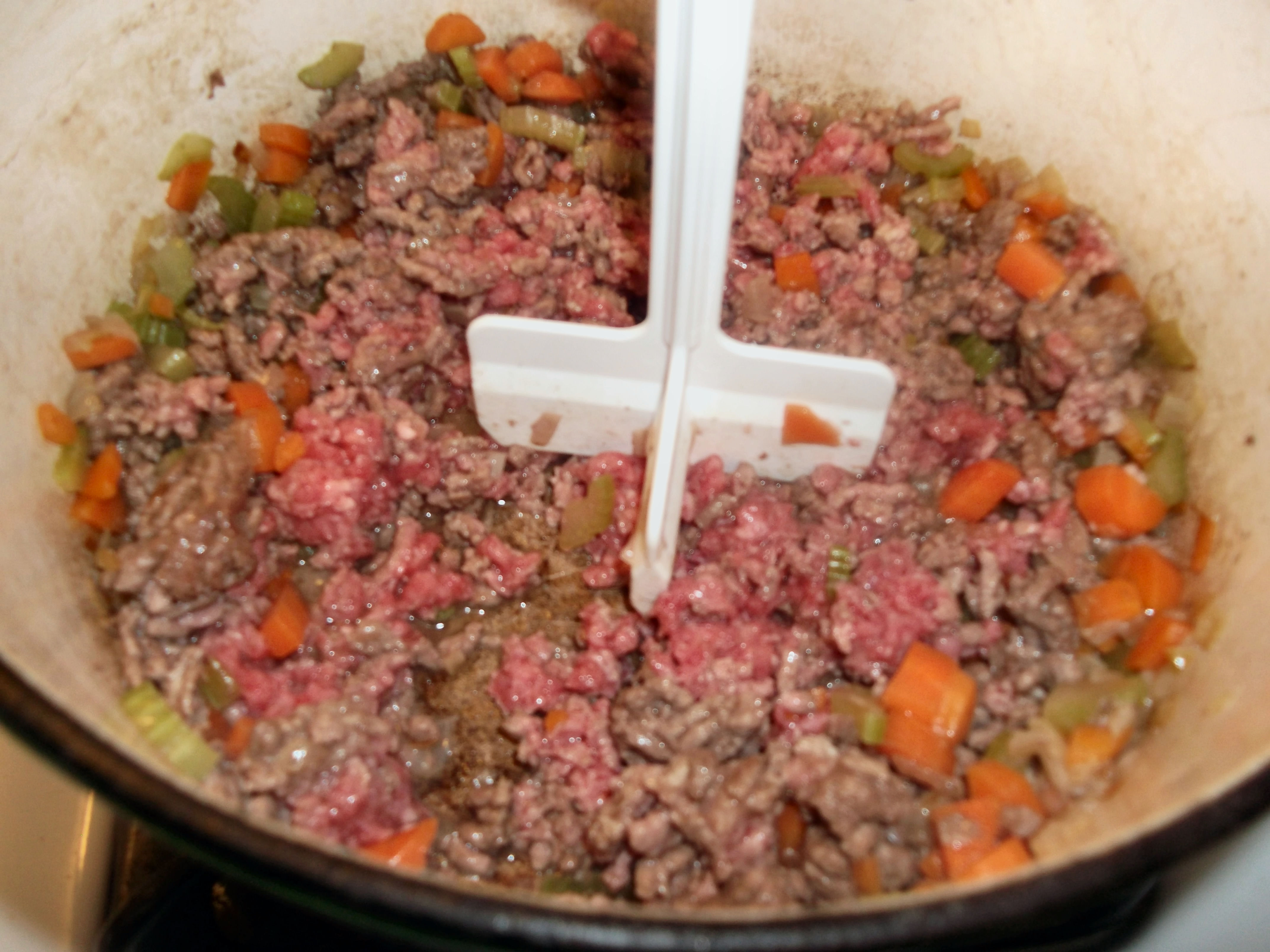 Add the celery and carrot, cook for 2 minutes, then add the ground beef.