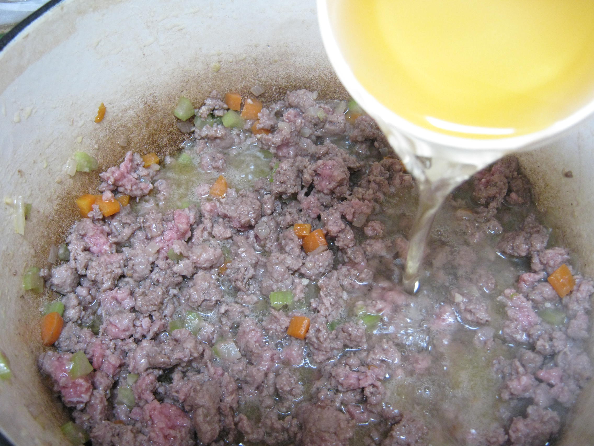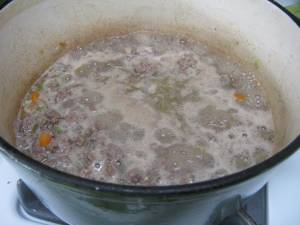 Now, let’s get back to our Bolognese sauce. Once the wine has evaporated, turn the heat down to medium and add the milk and the nutmeg.