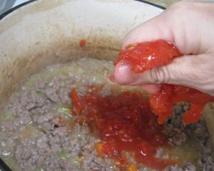Cook, stirring frequently, until the milk has evaporated. At that point, add the tomatoes. If using canned diced tomatoes, just dump them in along with the juice. If using canned whole tomatoes, you can either chop them first or just squeeze them – gently! – with your hands. They will splatter, so don’t be too aggressive or you’ll have tomato splotches all over your stove and clothing.