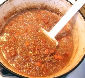 In a Dutch oven or large heavy pot, add the onion with the oil and butter and sauté briefly over medium heat until translucent. Add the celery and carrot and cook for 2 minutes. Add the ground beef, crumbling it in the pot with a fork. Add 1 teaspoon salt, stir, and cook only until the meat has lost its red, raw color. Add the wine, turn the heat up to medium high, and cook, stirring occasionally, until all the wine has evaporated, 10 minutes or so.