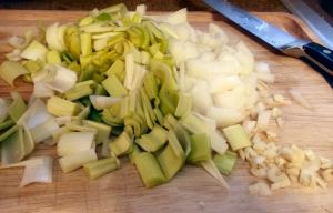 Drain and set them aside. Next, chop the onions, leeks, and garlic. A medium dice is fine – it all gets pureed later anyhow, so don’t worry too much about making it pretty.