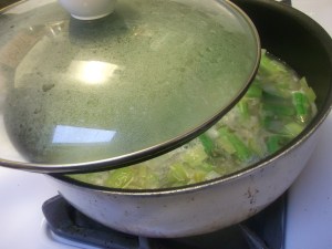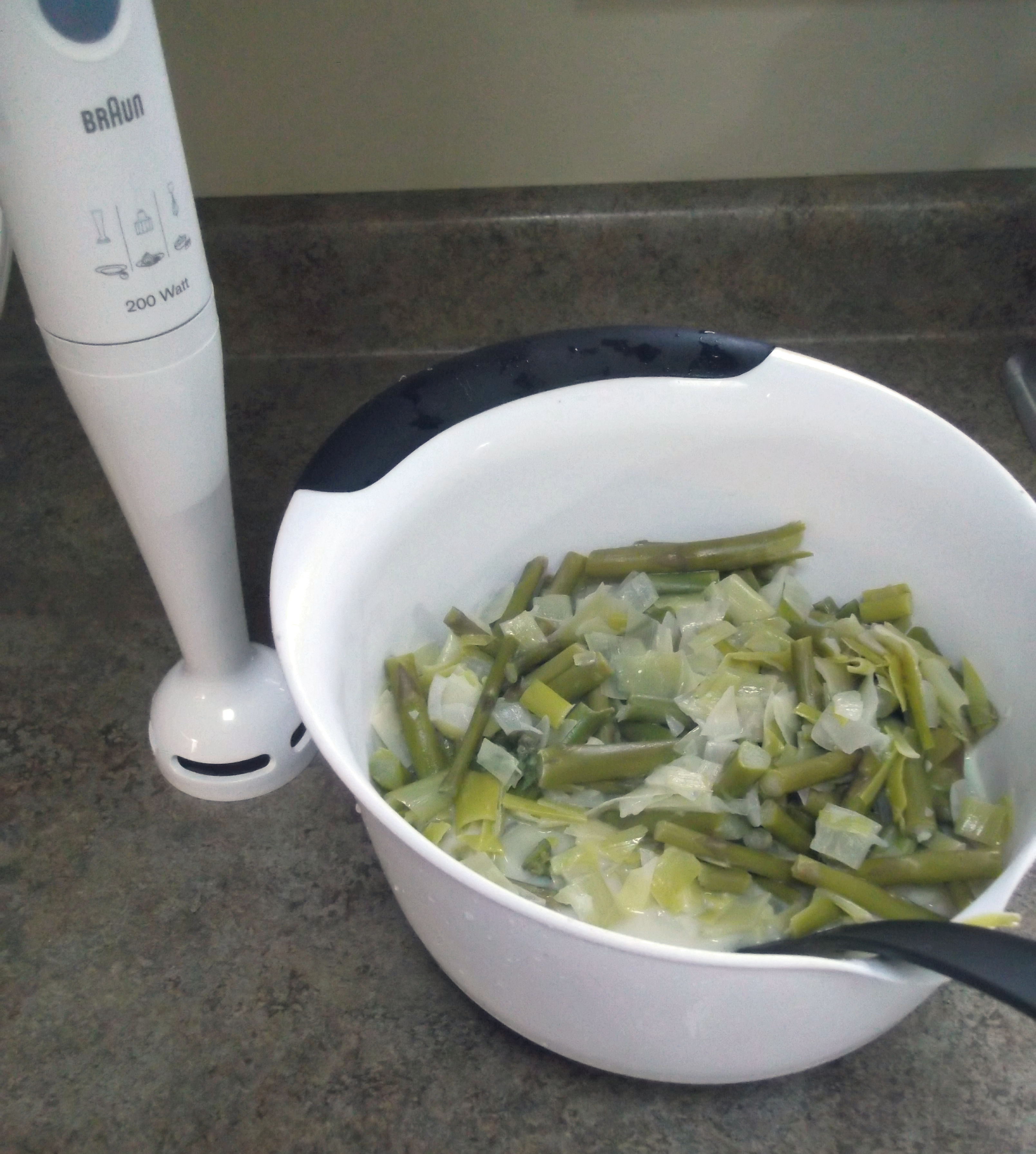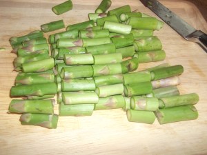 Sauté until soft and translucent, about 5 minutes. Meanwhile, chop the asparagus into 1- to 2- inch pieces. Again, it will be pureed, so it doesn’t need to be pretty.
