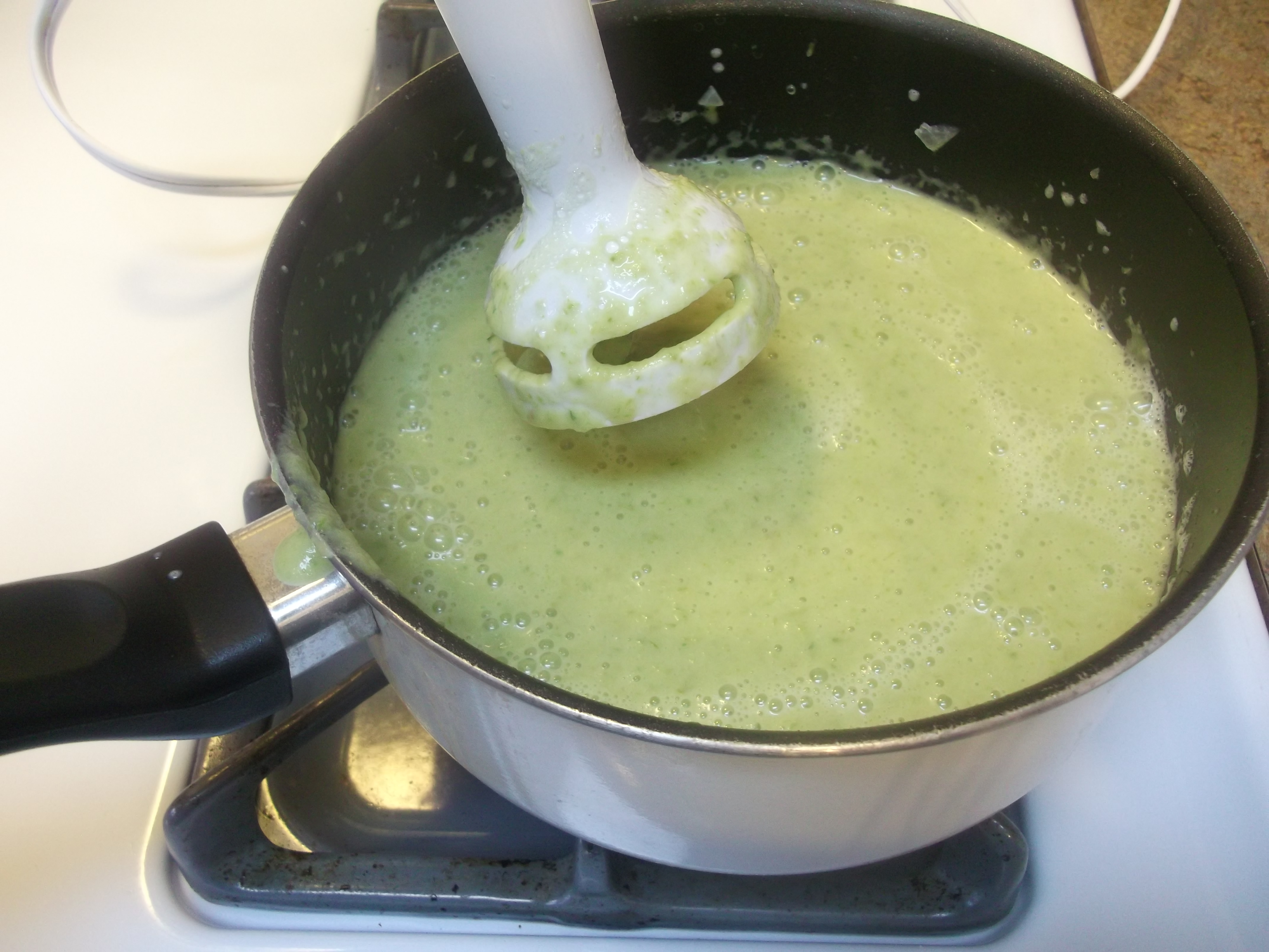Using an immersion mixer (or pour it into a blender), puree the ingredients until smooth. Transfer the soup to a deeper pan, if needed for this step, in order to keep the immersion mixer tip submerged in the liquid. I’ve learned from experience that if the liquid is too shallow, it just splatters it all over me, my stove, and my walls. Not fun. Plus it’s a waste of perfectly good soup.