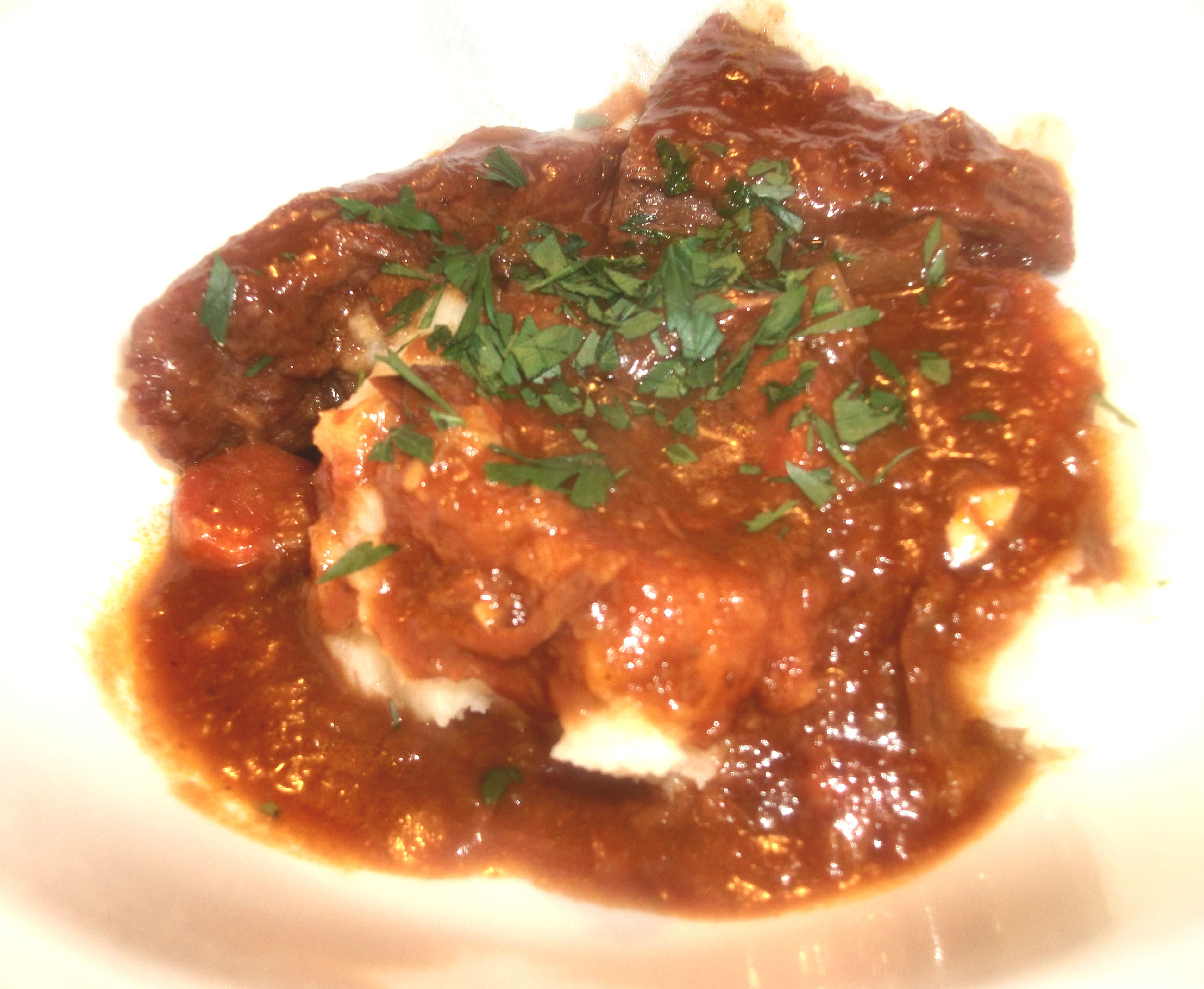 Add a little more oil if the pan is dry, and stir in the vegetables. Let them cook for a few minutes, then add the garlic: stir it in well and be careful not to let it burn. Add the Lipton’s packet and pour in one can of tomato juice/V8. Stir well to mix, and scrape up all the bits from the bottom of the pan. Pour the mixture into preheated crock pot. Top off the crock pot with tomato juice/V8 until the meat is completely covered. Cook on low 8-10 hours, or high 5-6 hours.