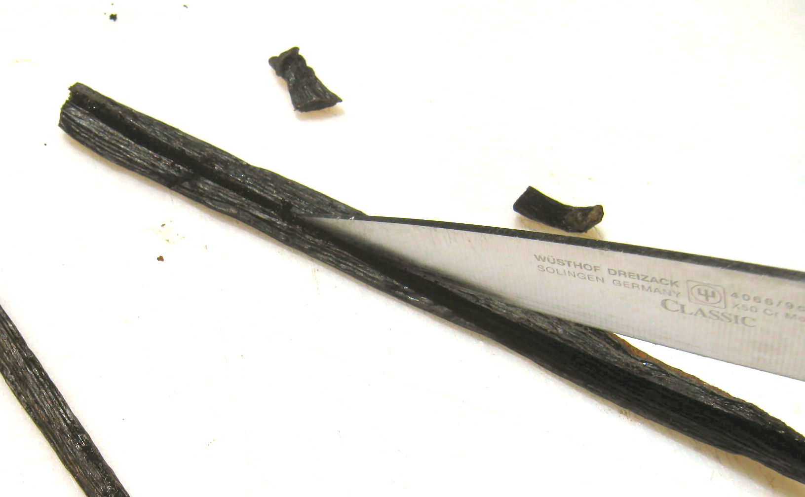Split vanilla beans lengthwise. Be careful not to cut all the way through it: you don’t want to cut it all the way in half, just through the first layer, to open it up. (But if you do go all the way, don’t despair. Both halves can still be scraped and used.)