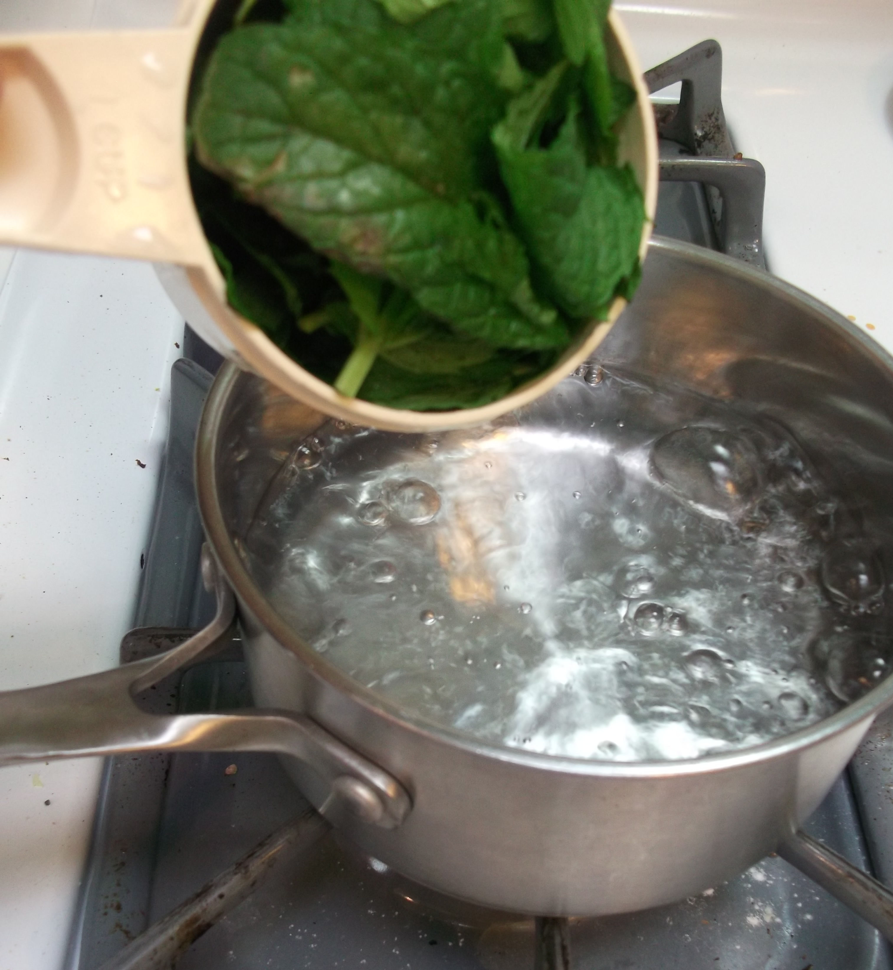 Place one cup sugar in a small saucepan and pour in one cup of water. Stir to combine, and bring the mixture to a boil. Keep stirring until all the sugar has dissolved and the liquid is clear. Then add the mint.