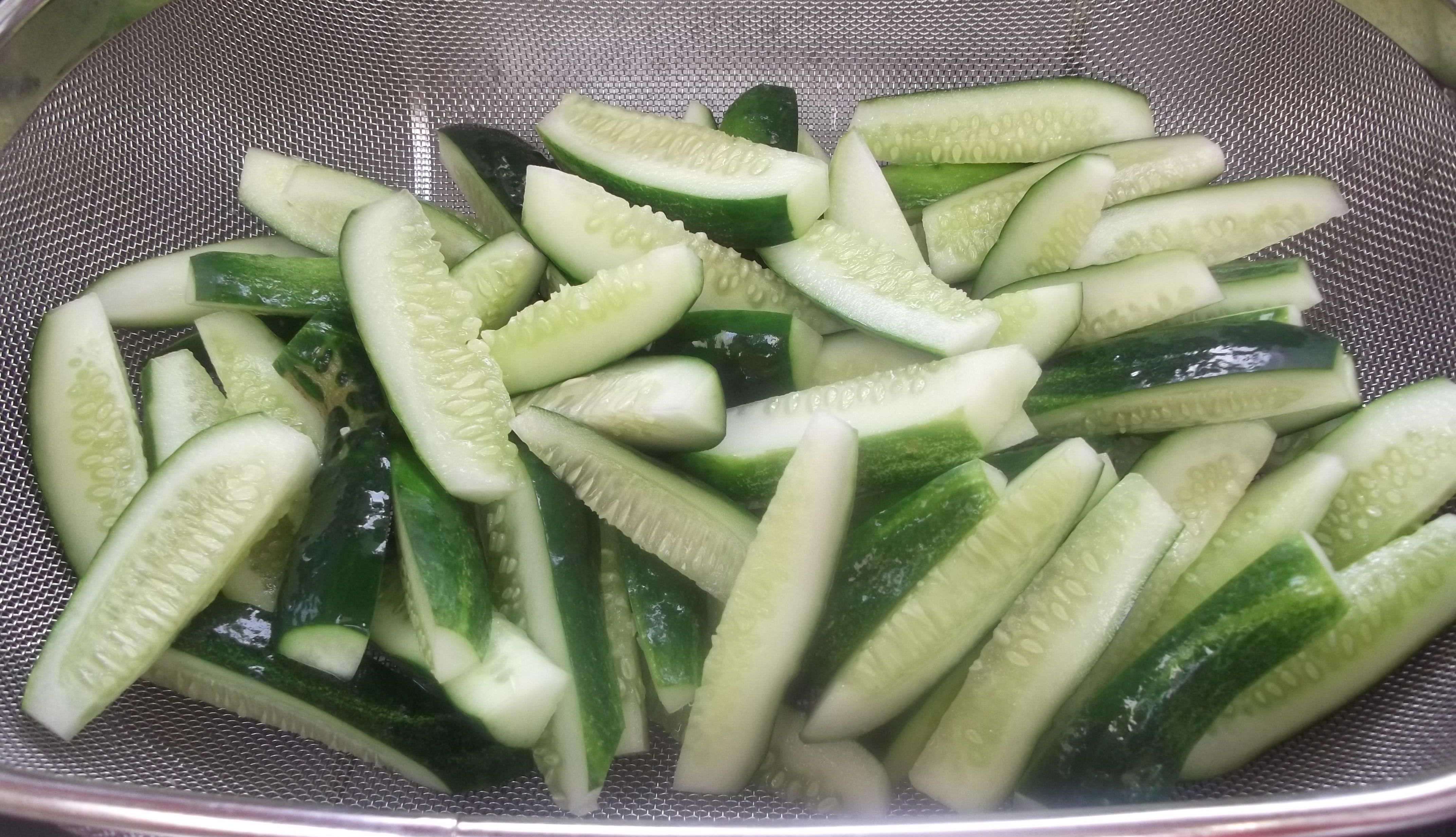 Wash the cucumbers thoroughly and cut them into spears. Place the spears in a large container and cover with water. Refrigerate for at least two hours, but no longer than four.