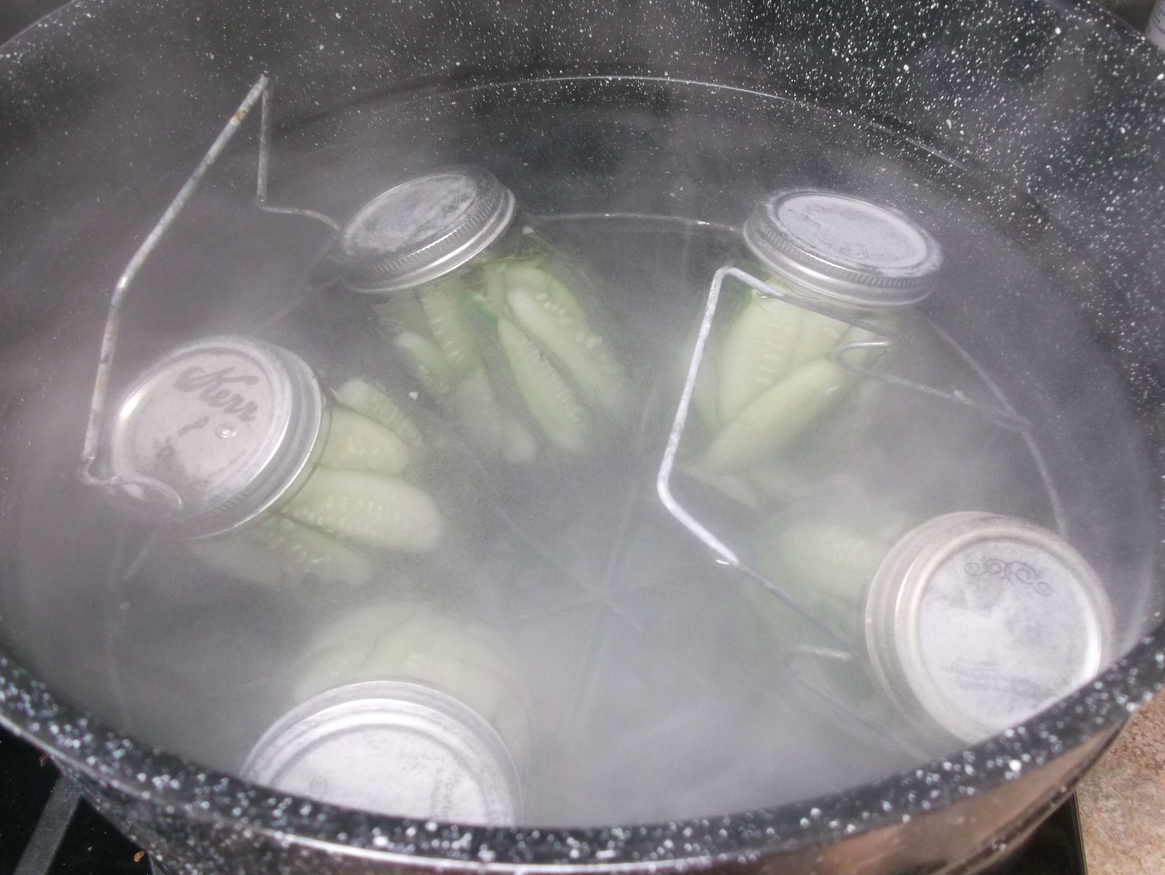 Place the spears in a large container and cover with water. Refrigerate for at least two hours, but no longer than four. While the cucumbers are chilling, boil the canning jars and lids in a large pot for 10 minutes to sterilize. Place the jars on a cookie sheet covered with a thin dish towel. Leave the lids in hot water.