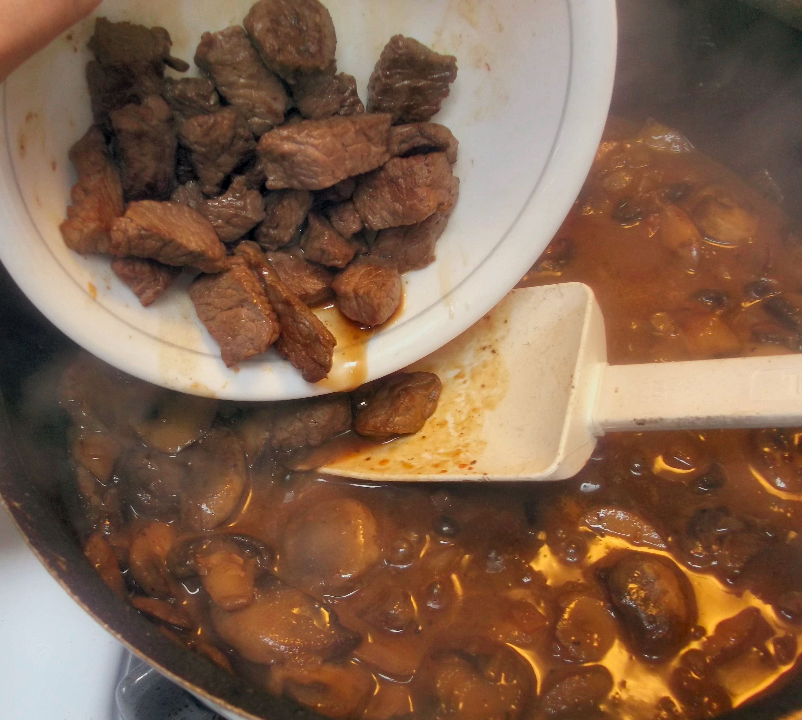 Add the mustard paste, stir, then add the wine/vermouth and cook until evaporated. Pour in the beef/mushroom broth mixture and bring to a simmer, scraping the bottom of the pan with a wooden spoon (or a rubber spatula, if you’re a kitchen rebel like me) to loosen any browned bits.