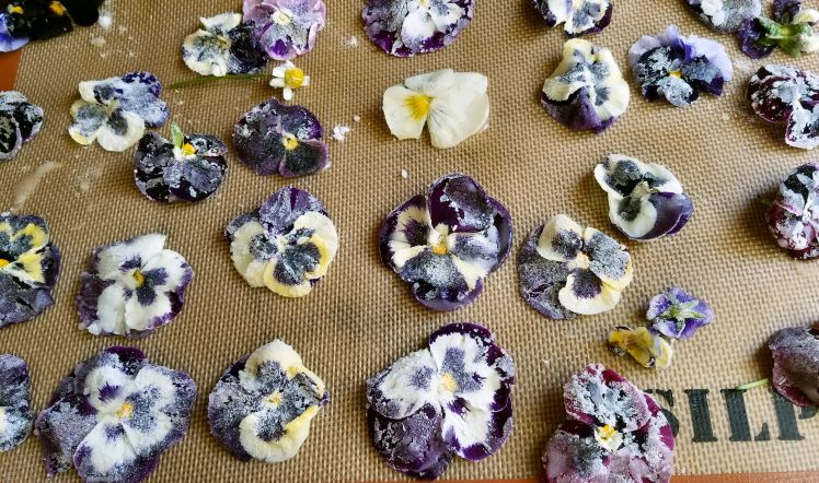 One of my favorite ways to preserve a bounty of colorful edible flowers is by candying them. Eat them on their own or use them as a beautiful topping to desserts. This method works well with just about any edible flowers or leaves. I particularly love candied pansies, violas, nasturtiums, anise hyssop and mint.