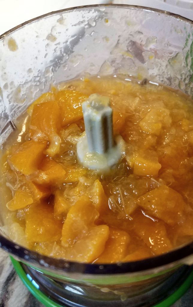 Now it’s time to break up the orange peels/rinds into tiny chunks. You can either process the fruit (in batches) in a blender/food processor or use an immersion blender right in the IP.