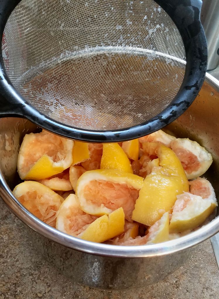 Marmalade uses the entire fruit – rind and all – so be sure to wash each piece very well before you begin. I soak mine for about 10 minutes in a sink full of water with some vinegar to clean them and remove any pesticides.